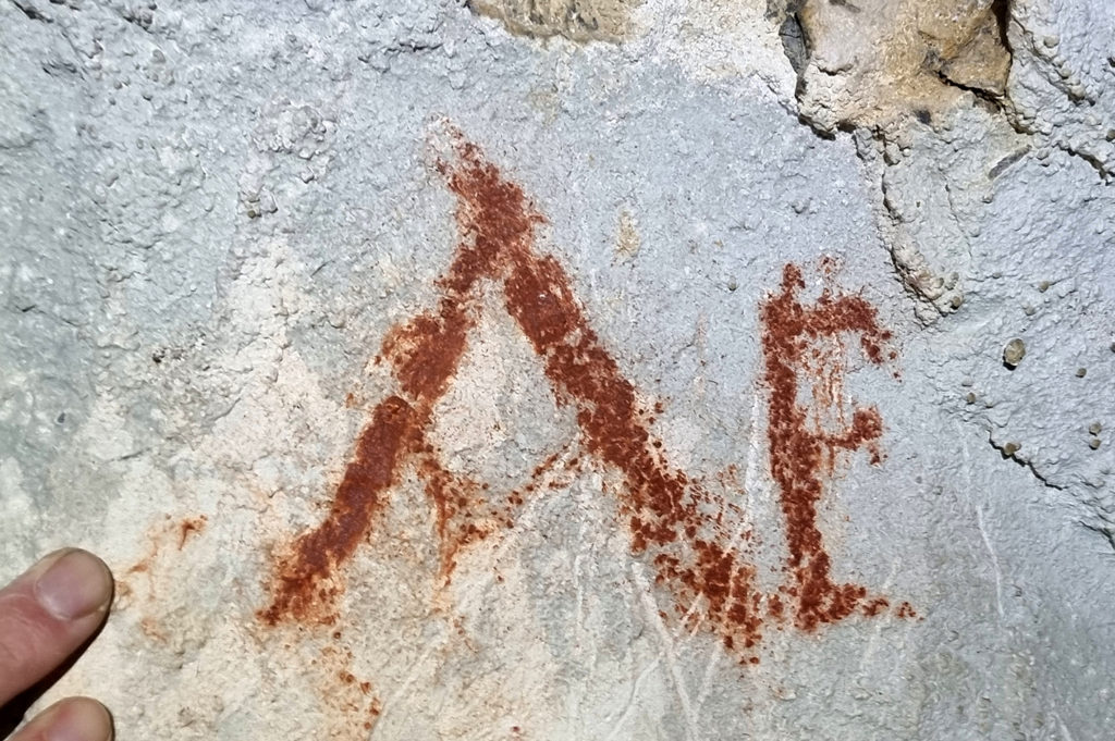Initialen in Rötelschrift sind ein Beleg dafür, dass die Höhle bereits im 17. oder 18. Jahrhundert begangen wurde, wohl auf der Suche nach (Eisen-)Erzen, die damals sehr gefragt waren.