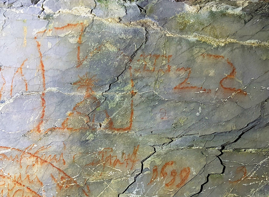 Rötel-Inschriften aus dem Ende des 17. Jahrhundert. Die Strichzeichnung dürfte das Kloster Engelberg symbolisieren.